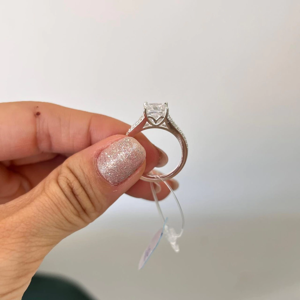 Anel quadrado com a pedra central elevada, modelo todo cravejado, com detalhes de coração na lateral da pedra. As laterais são totalmente cravejadas de zircônia.