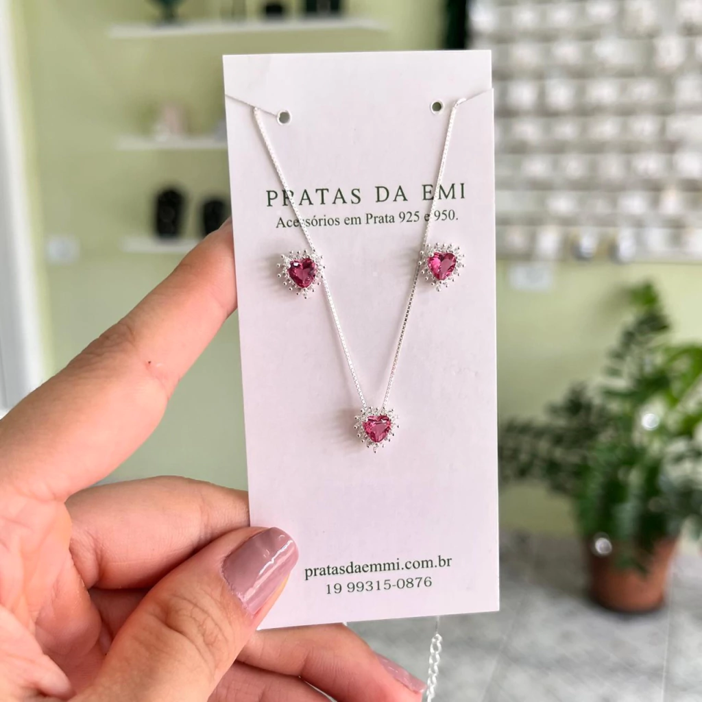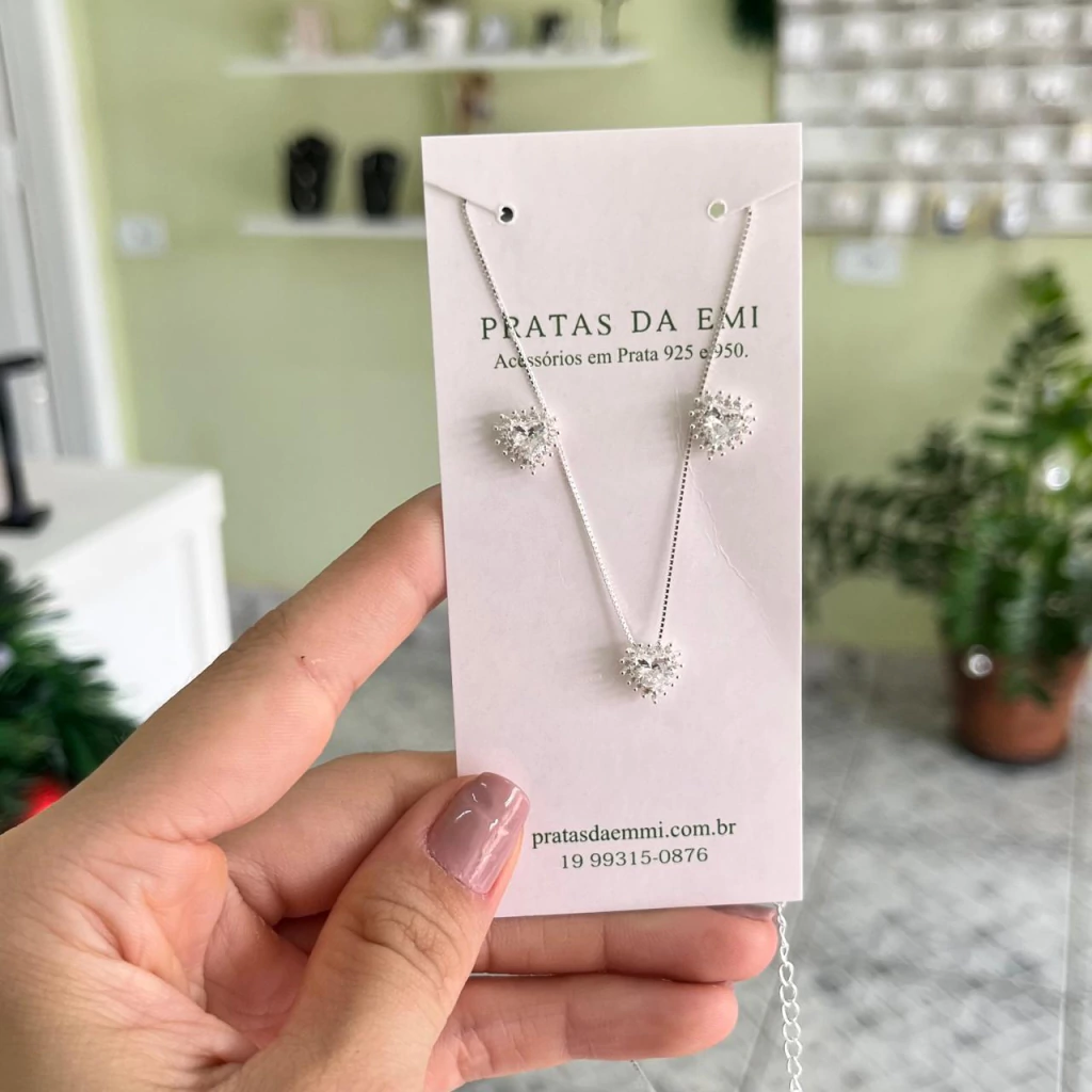 O conjunto acompanha brinco e colar; o colar é modelo veneziana com 45 cm.