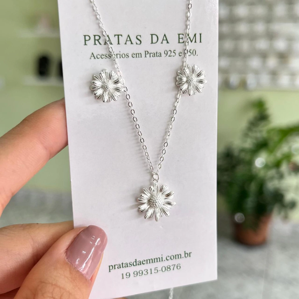 O conjunto acompanha brinco e colar; o colar é modelo veneziana com 45 cm.