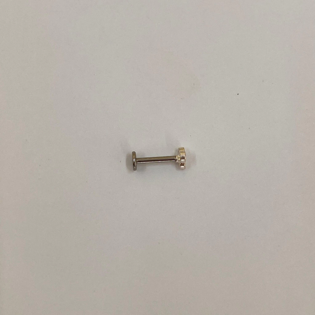 Piercing com haste de aço cirúrgico com 8mm de comprimento, detalhes da base na frente em Prata 925.